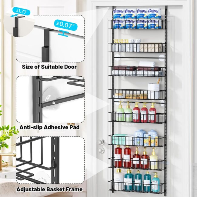 Maximize vertical storage with the ElegantArray 8‑Tier Over‑the‑Door Pantry Organizer, featuring adjustable metal baskets that let you customize spacing for spices, cans, snacks, cleaning supplies, or bath items without drilling into walls. The heavy‑duty iron construction and door‑mount design offer durable, space‑saving organization that fits most standard interior doors for pantry, laundry, office, or bathroom use. With a compact footprint of 6.1 inches deep, 16.34 inches wide, and 63.78 inches high, the rack delivers generous capacity while keeping doors functional and clutter off shelves and counters.