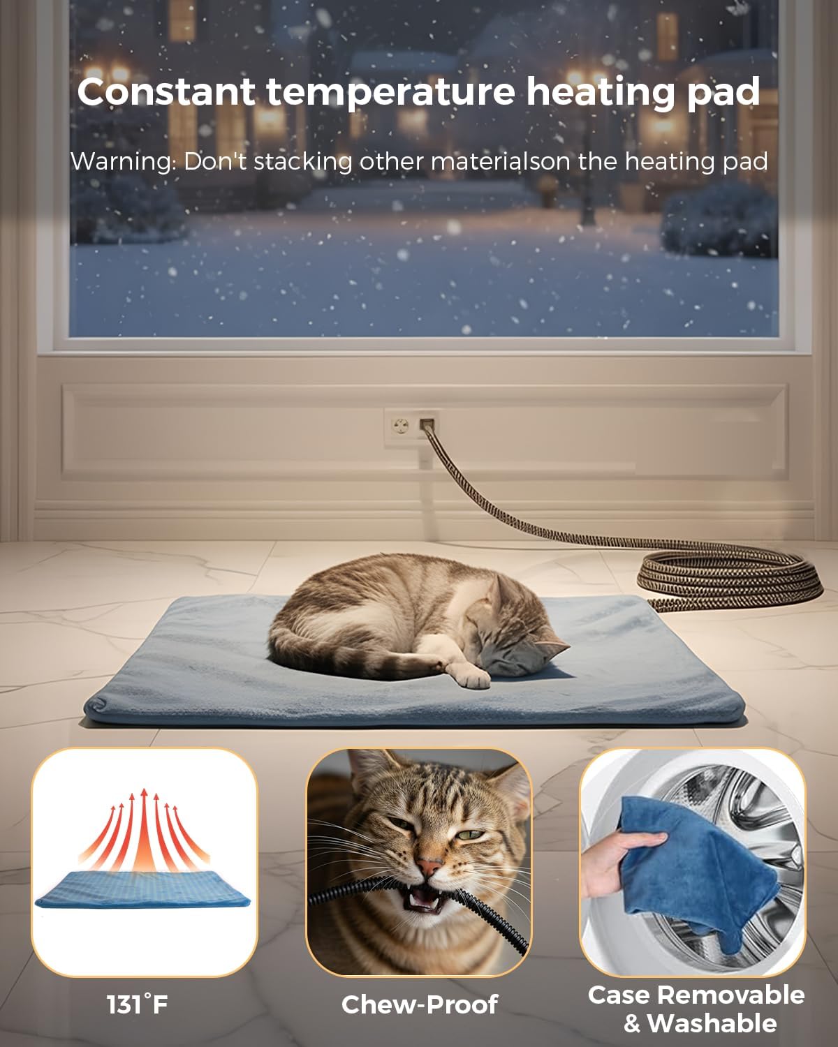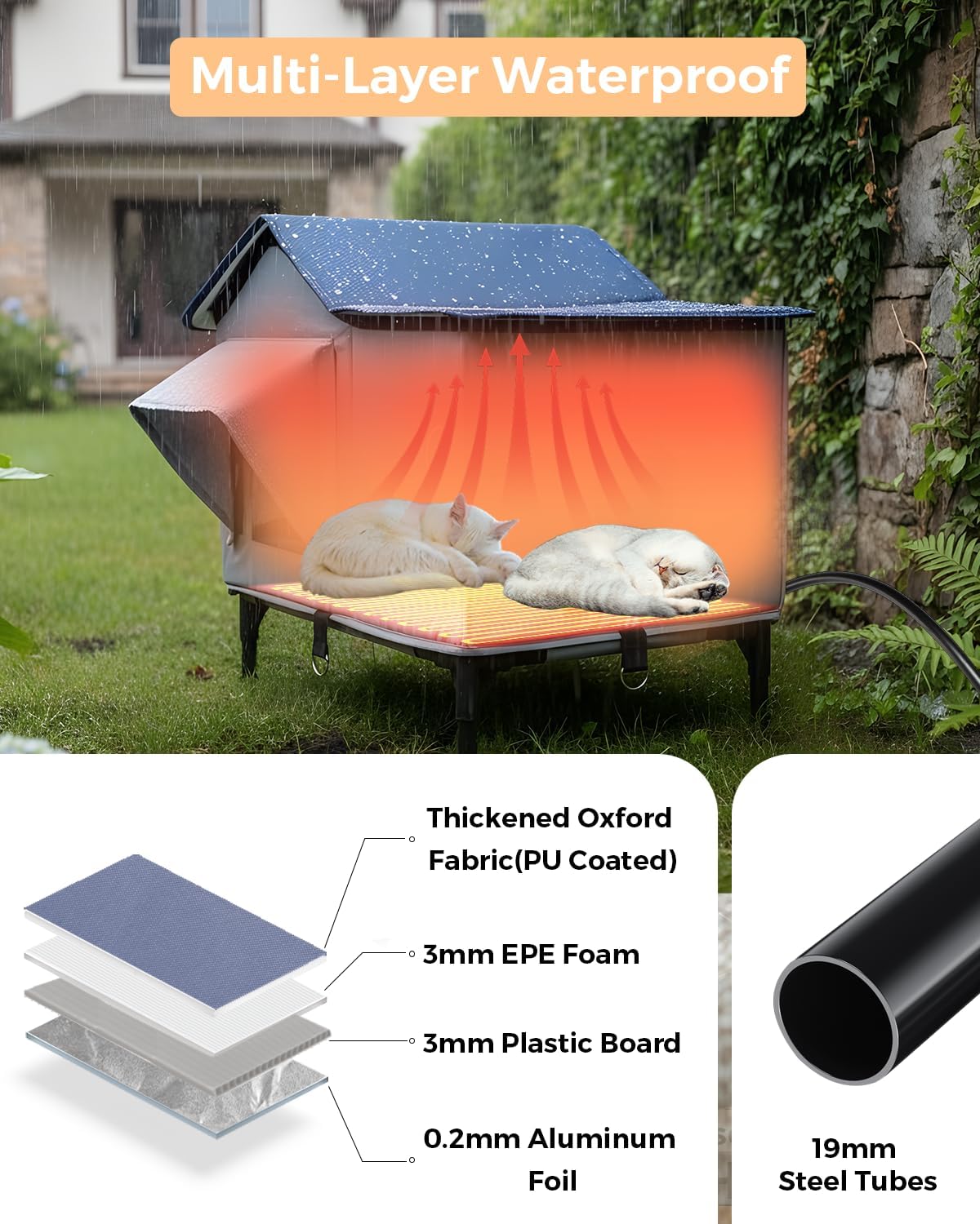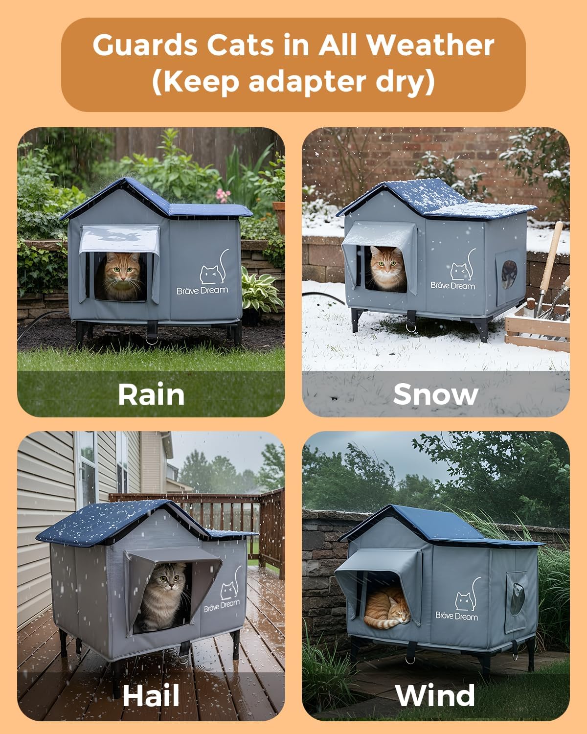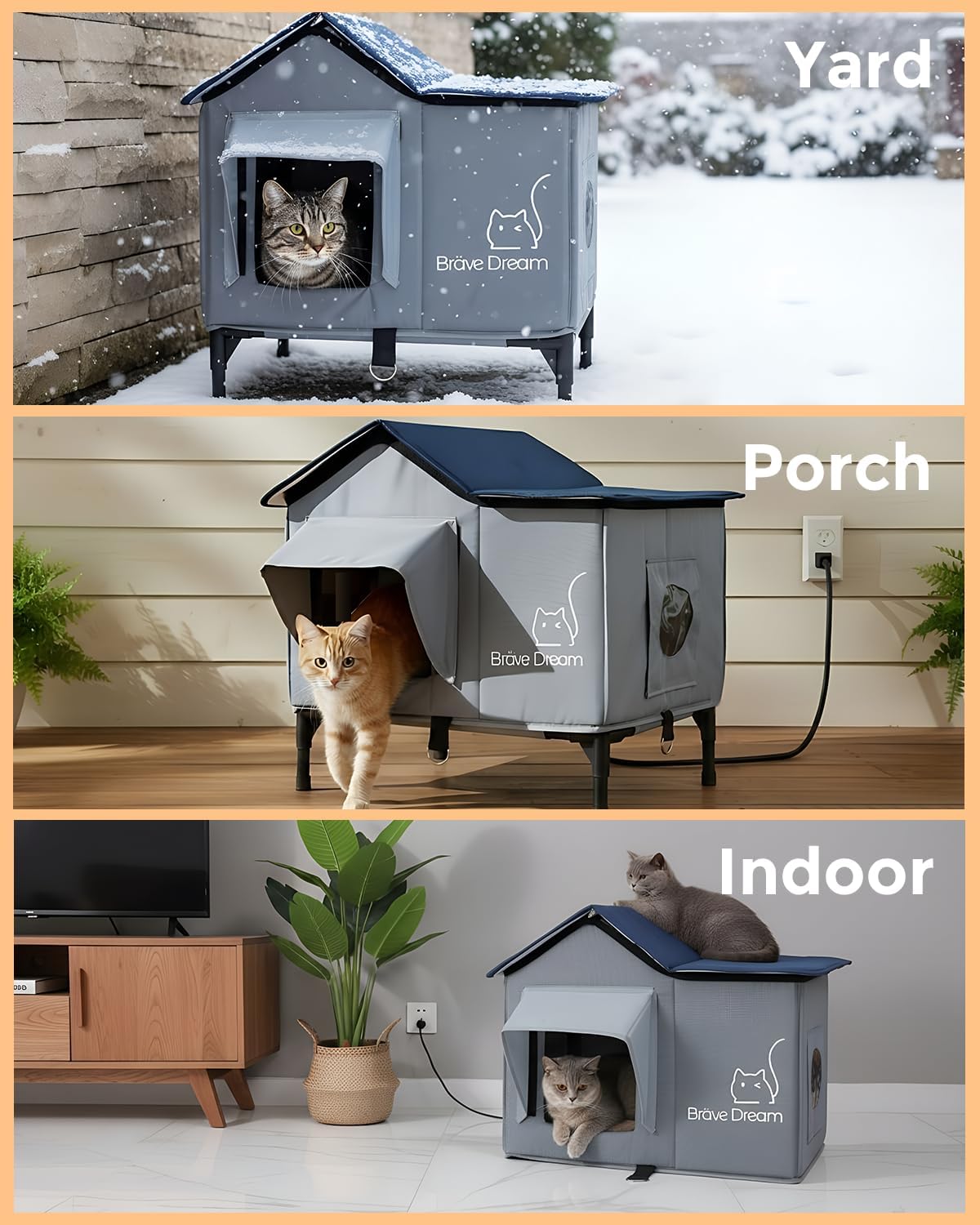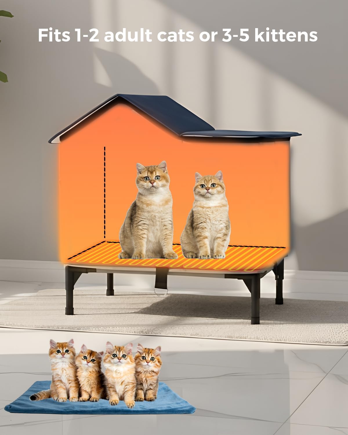 Give outdoor and porch cats a warm, secure retreat with this insulated heated cat house designed to keep felines comfortable in cold, wet weather. A weather‑resistant outer shell and tightly stitched seams help block wind and light rain, while the elevated base reduces ground chill and splashback near entryways. Inside, a low‑voltage heating pad offers gentle, consistent warmth for safe, all‑day comfort; a removable, washable cover keeps the sleeping area fresh with minimal effort. Dual doorways promote easy access and quick escape, and the included clear flap helps retain heat without limiting visibility. Assembly is fast and tool‑free thanks to a foldable panel design that secures with hook‑and‑loop tabs, so setup takes minutes on porches, garages, covered patios, or sheds. A chew‑resistant, protected power cord routes cleanly to a nearby outlet, and the house’s compact footprint fits small spaces while still accommodating one large cat or two kittens. Use it as a year‑round cozy den: in winter with the heat, and in milder months as a dry, insulated hideaway. Durable materials and easy maintenance make it a practical upgrade for caregivers of feral, stray, or indoor‑outdoor cats seeking dependable warmth and shelter through changing seasons.
